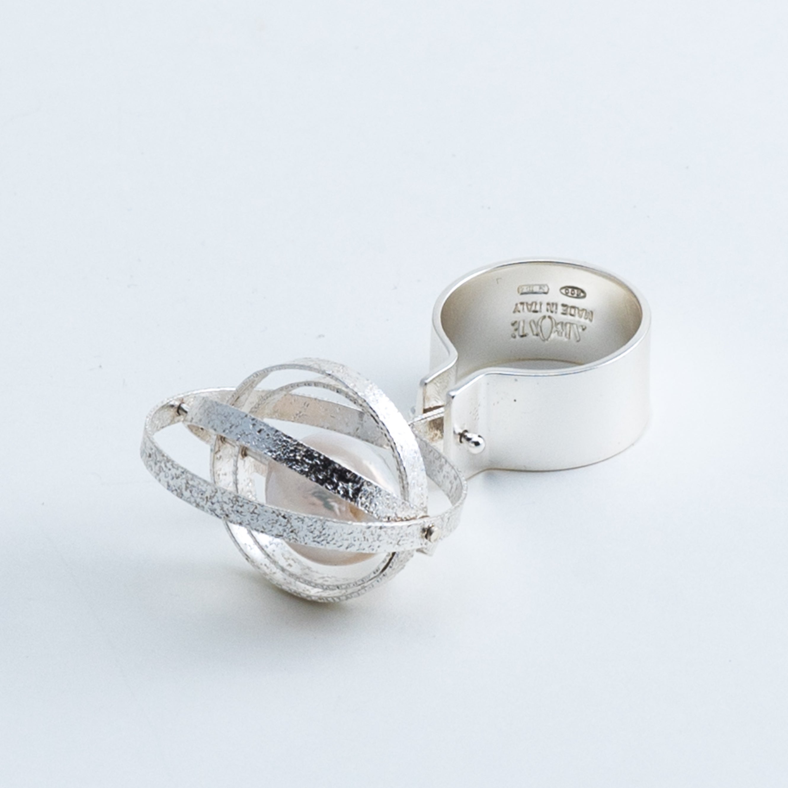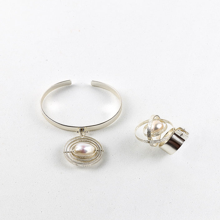 Ein Ring, der durch die Bewegungen des Trägers zum Leben erwacht. Die Dynamik der konzentrischen Kreise verleiht seiner Geometrie eine einzigartige und stets wechselnde Form. Im Inneren befindet sich eine kostbare Barockperle, die wie ein Planet um sie kreist. Barockperle aus Süßwasser (nicht kugelförmig) in Weiß. Material: Silber. Das Silber ist mit einem schützenden Antioxidans behandelt, um seine Schönheit dauerhaft zu bewahren.