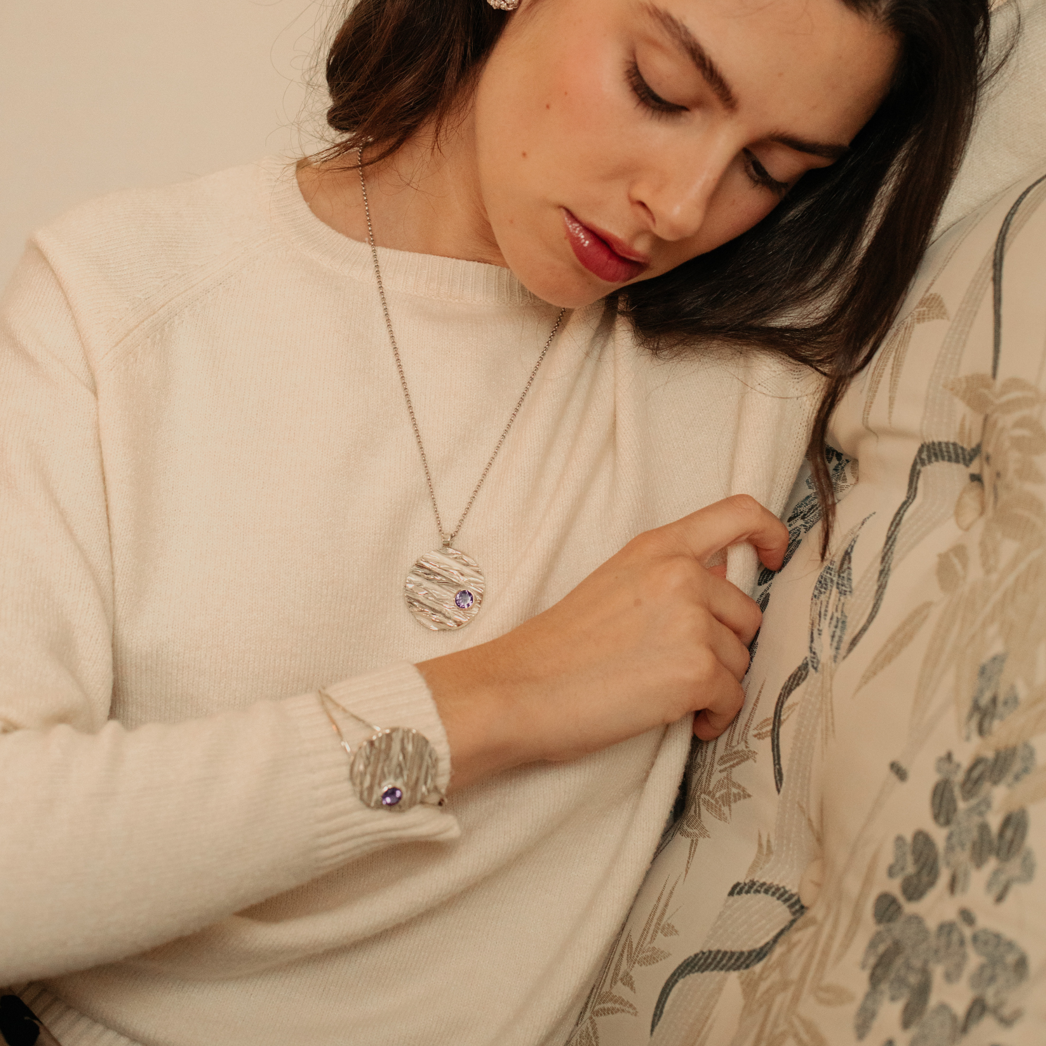 Ein Blatt handgewelltes Silber – ein geduldiger und filigraner Prozess, so wie die Wellen ihre Spuren am Ufer hinterlassen. So entsteht dieses Armband, besetzt mit einem Amethyst.