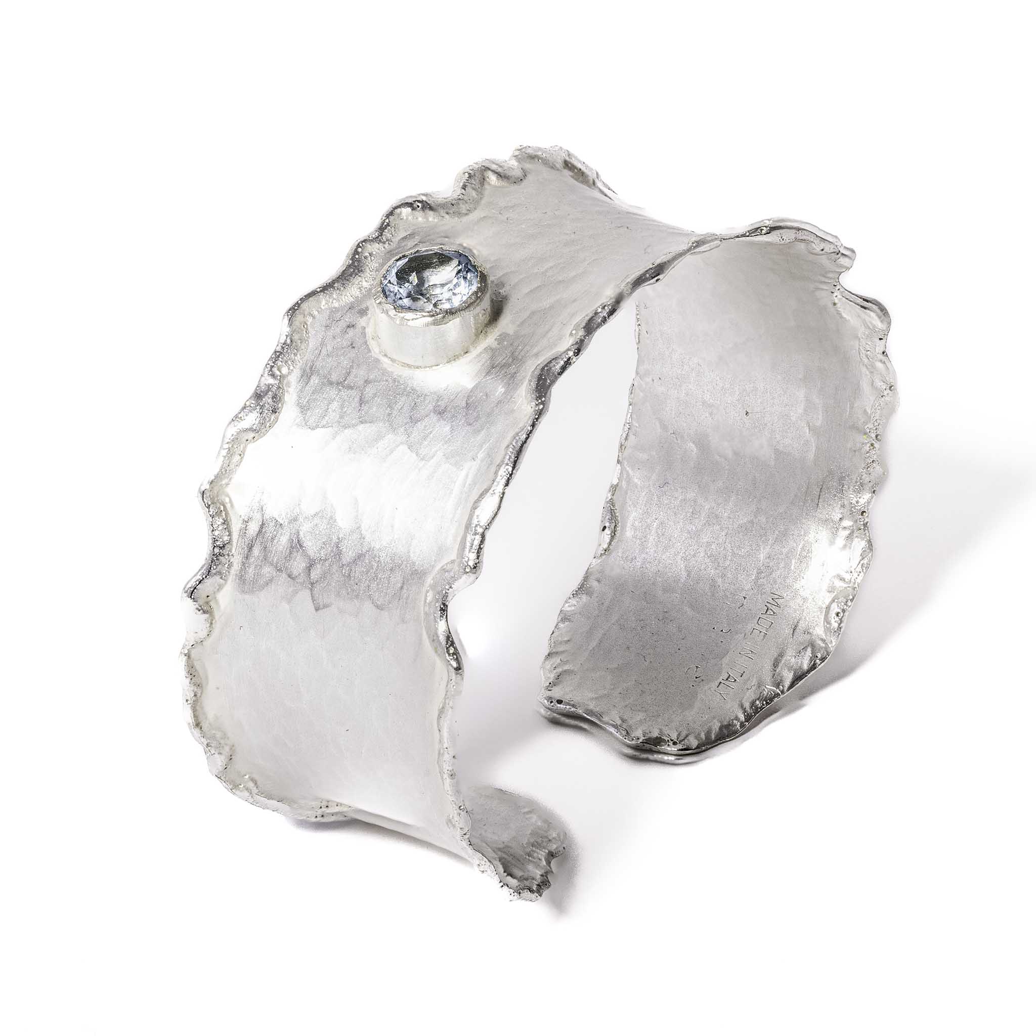 Gelötetes Armband mit einem blauen Topas, einem natürlich gefärbten Stein, der der Oberfläche des Schmuckstücks Licht und unerwartete Reflexionen verleiht. Steingröße: 6,5 mm. Innenmaße: Klein 5 cm / Mittel 6 cm / Groß 6,5 cm. Silber. Das Silber wird einer schützenden Antioxidationsbehandlung unterzogen, um seine Schönheit dauerhaft zu bewahren.