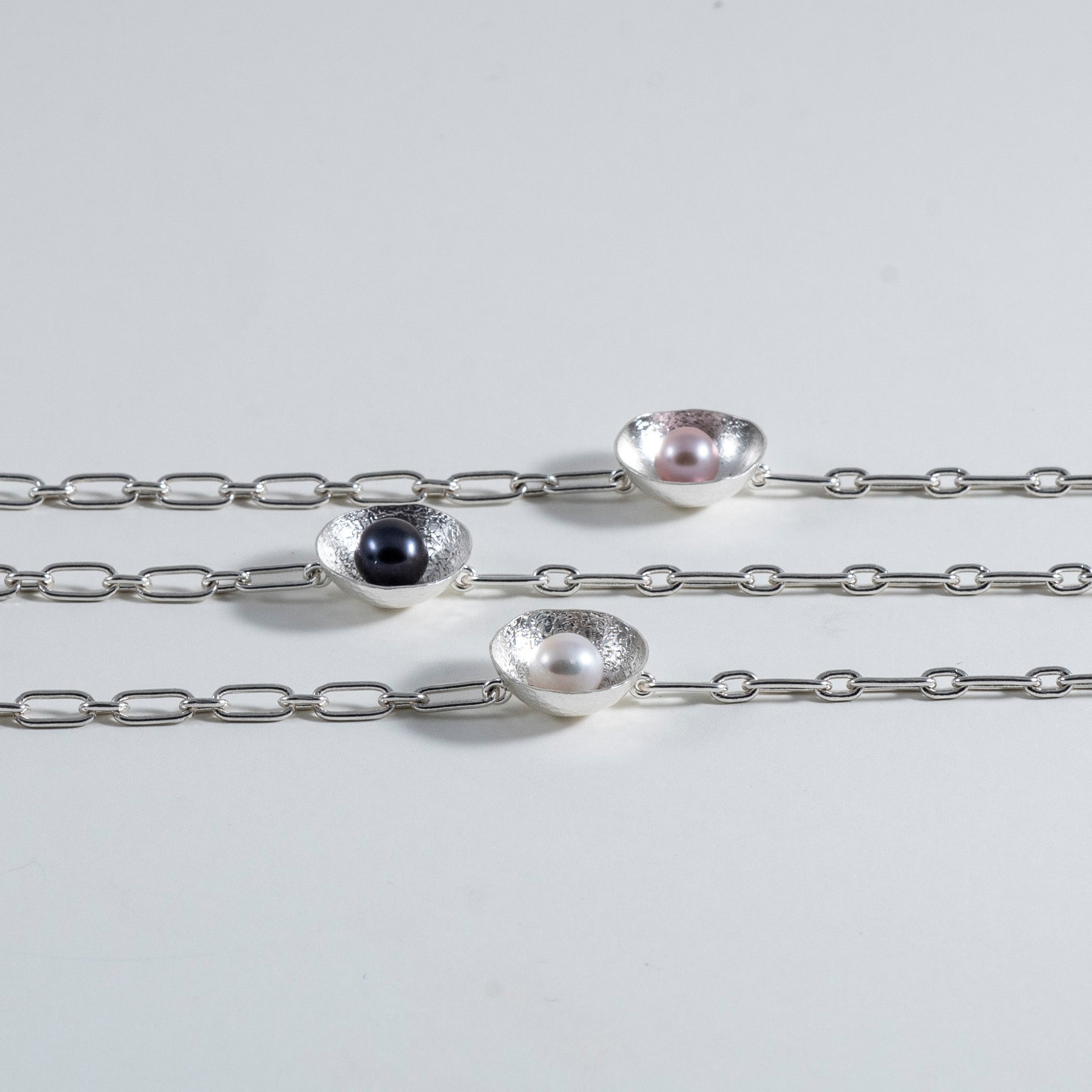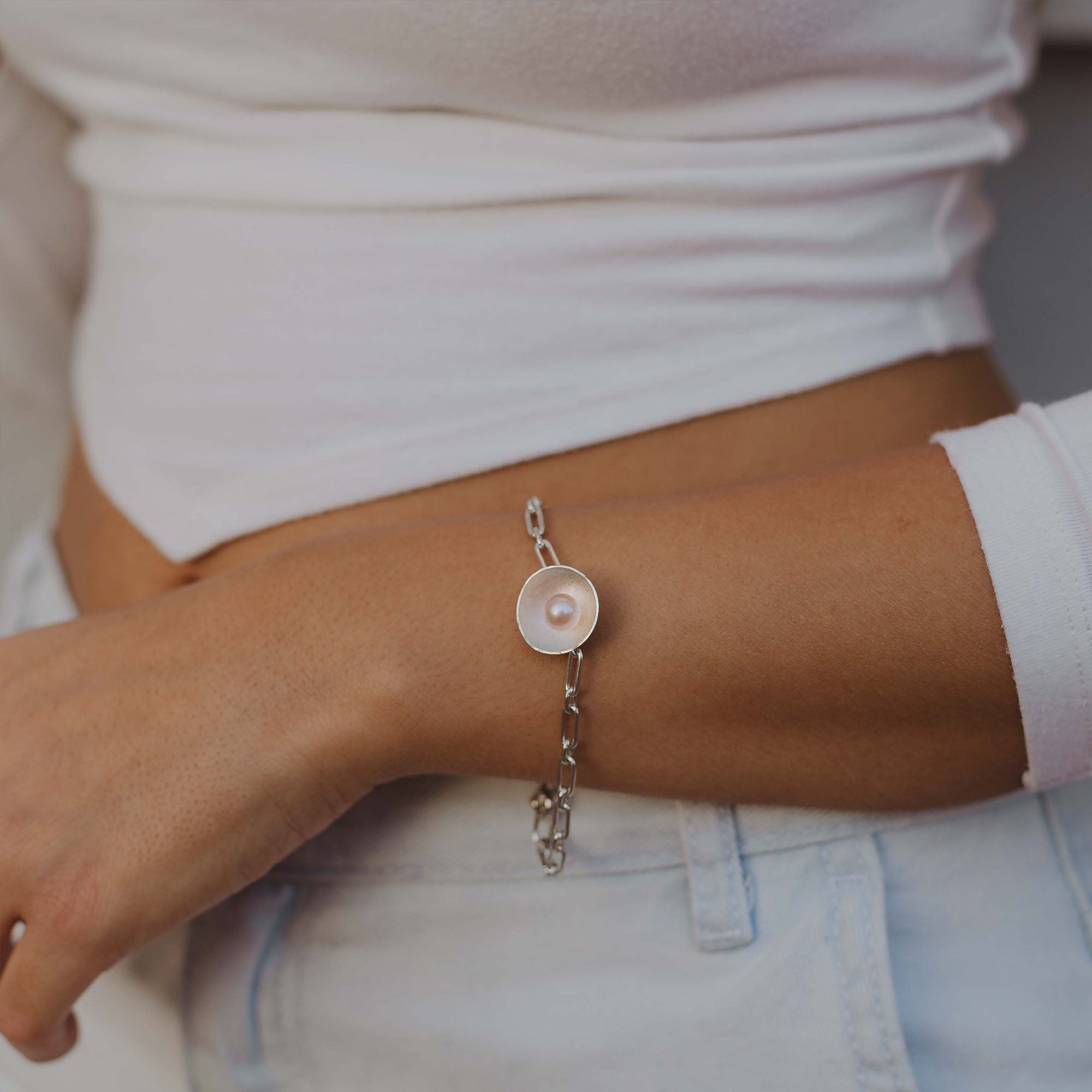 Perlenarmband aus gehämmertem Silber mit einer gerändelten Schale, die eine 7,5 mm große, kugelförmige Süßwasserperle enthält. Dank des rechteckigen Kettenglieds passt das Armband an jedes Handgelenk.