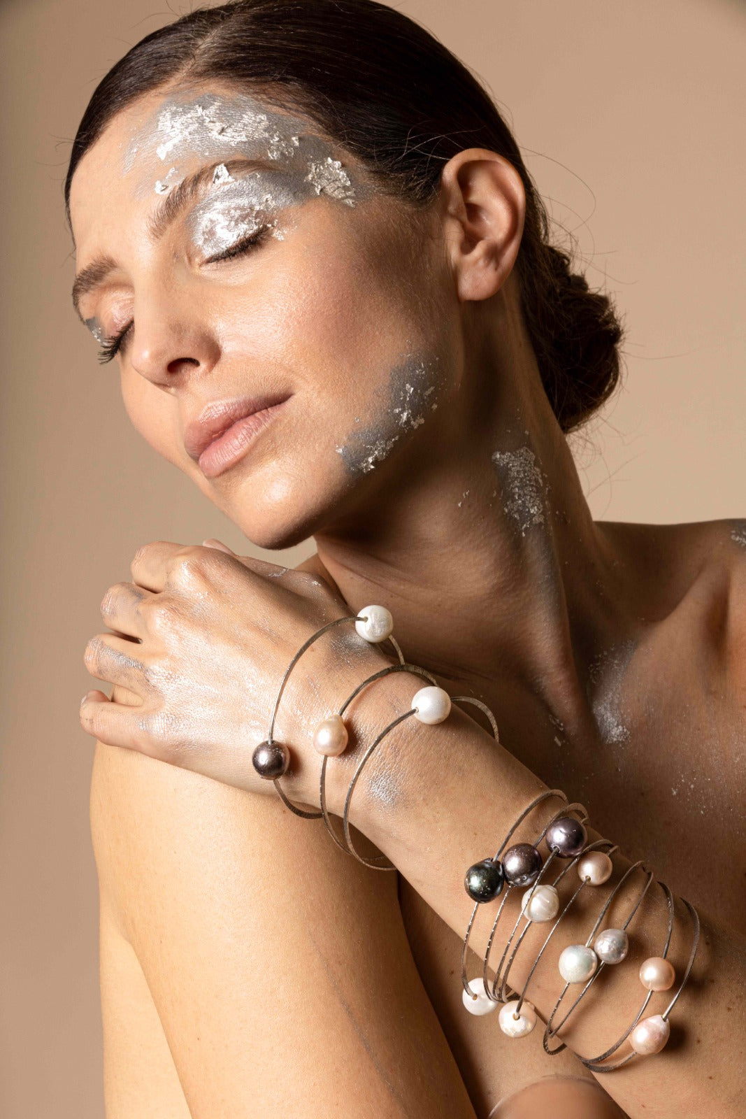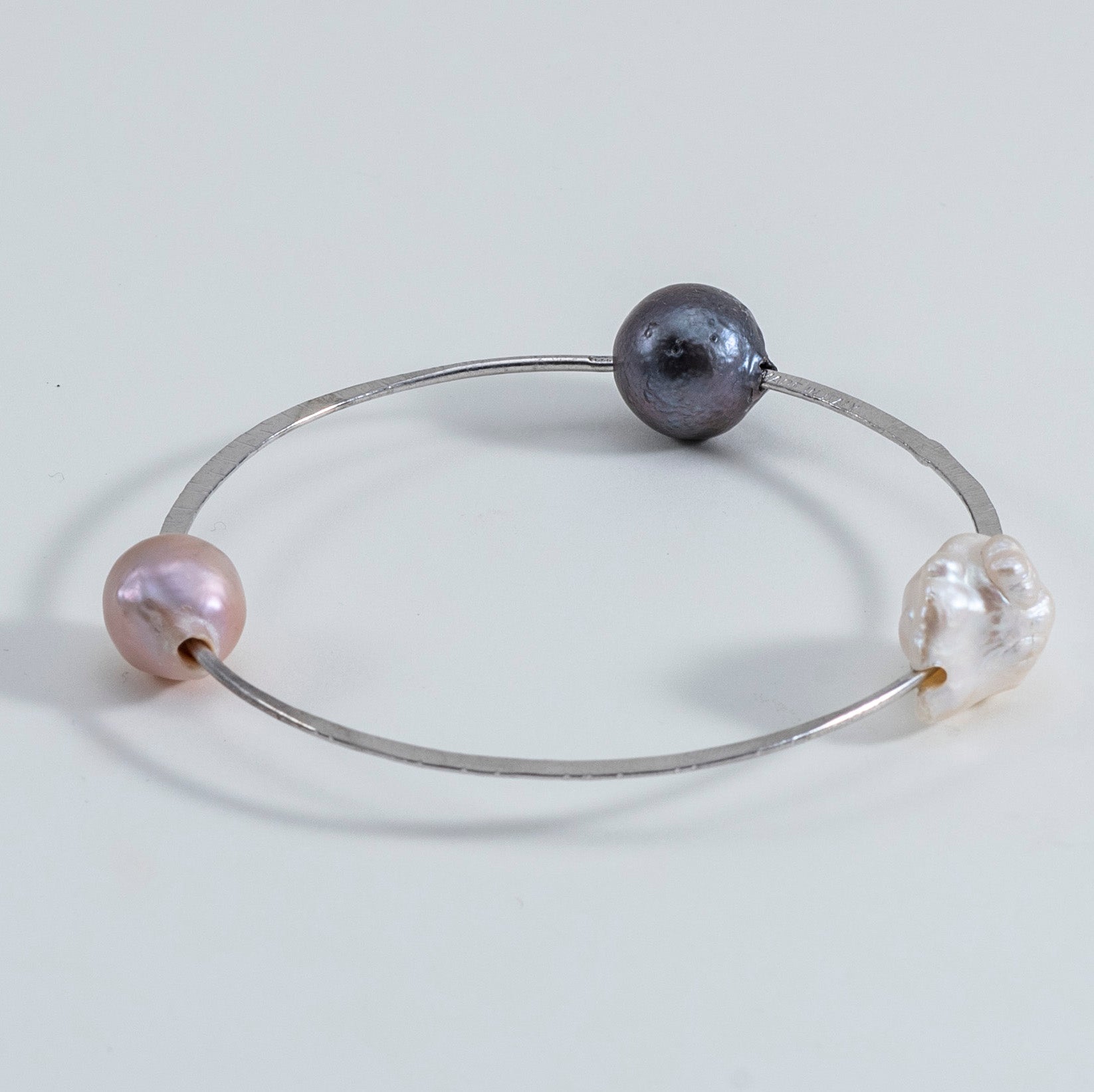 Ein eleganter, handgehämmerter Silberkreis umschließt drei Süßwasser-Barockperlen. Die einzigartige, natürliche Schönheit der Barockperlen und die handwerkliche Verarbeitung machen jedes dieser Armbänder zu einem Unikat. Armbandgröße: klein 6 cm / mittel 6,5 cm / groß 7 cm. Süßwasser-Barockperlen, ca. 15 mm. Material: Silber. Das Silber wird einer schützenden Antioxidation unterzogen, um seine Schönheit dauerhaft zu bewahren.