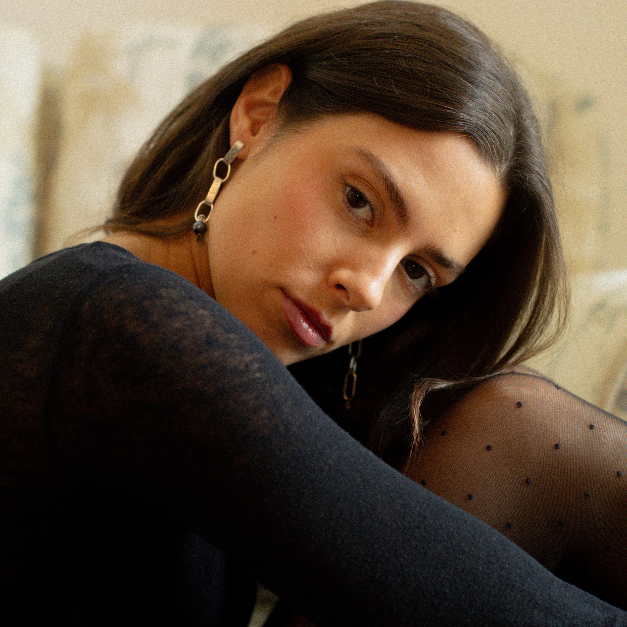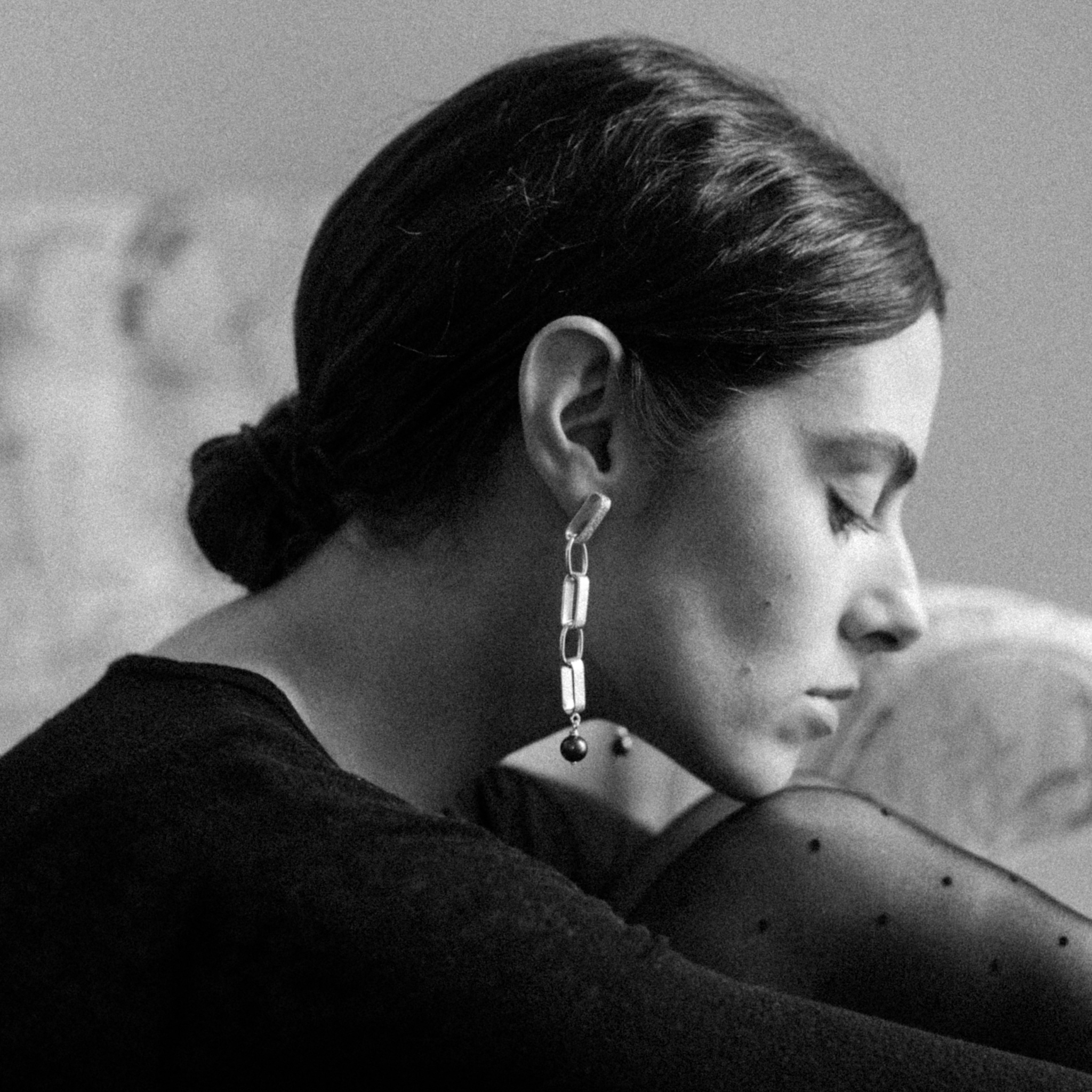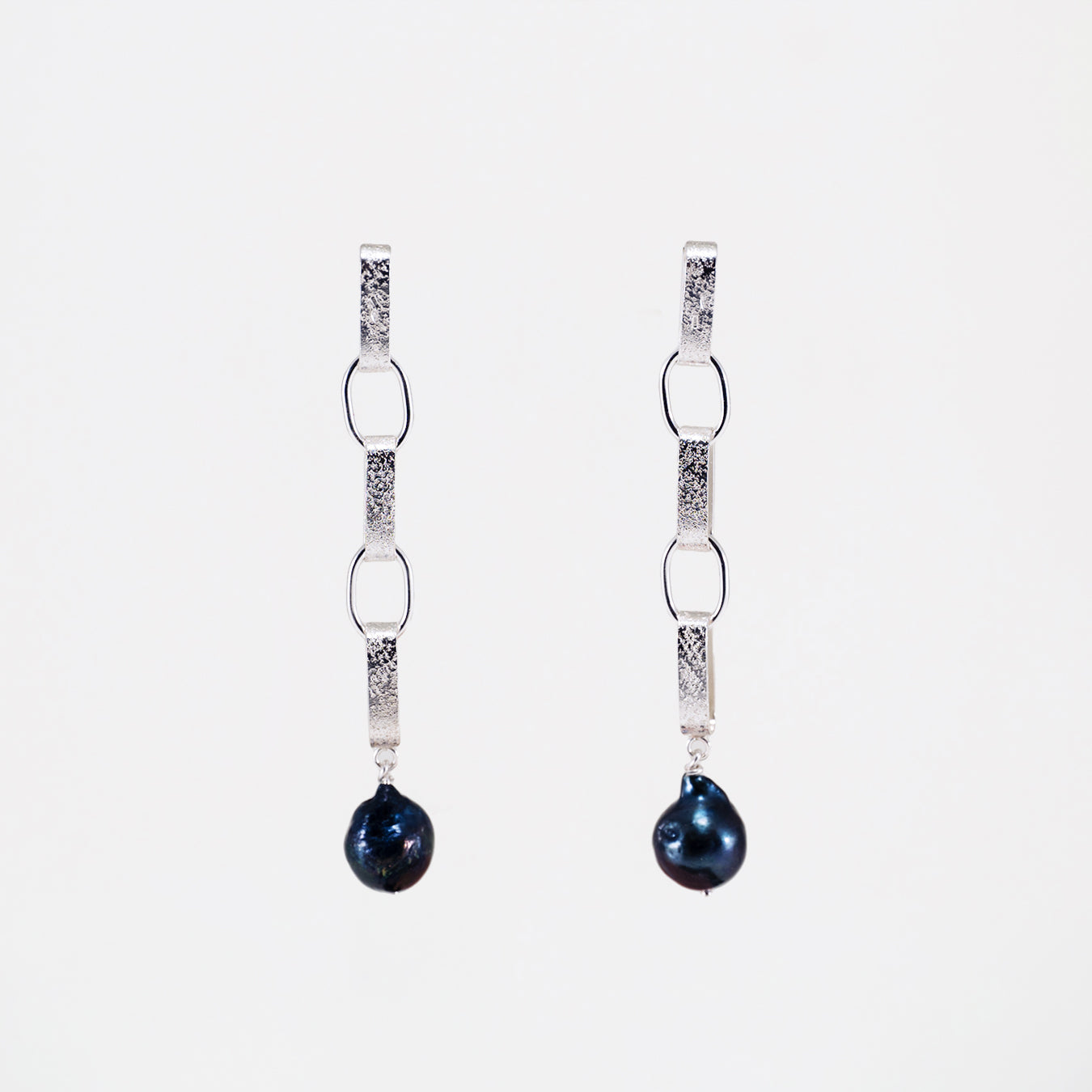 Diese breiten Gliederohrringe mit Barockperle vereinen maskuline und feminine Elemente.