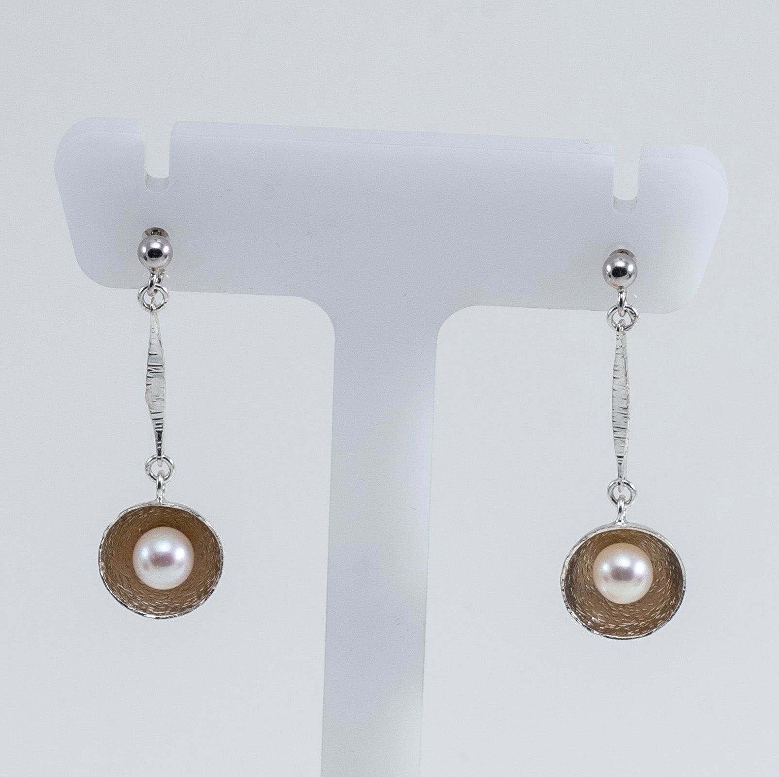 Ohrhänger aus gehämmertem Silber, bestehend aus zwei gerändelten Fassungen mit je zwei 7,5 mm großen, kugelförmigen Süßwasserperlen.